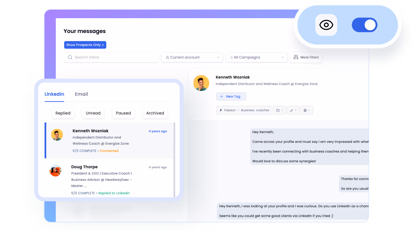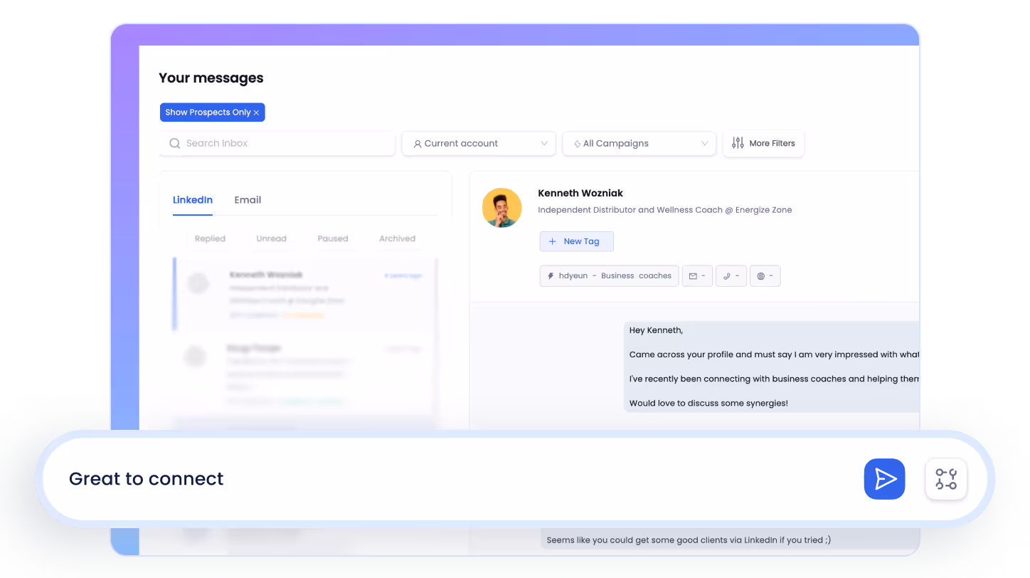 Reply directly to your leads from the inbox. No need to login to your email or LinkedIn account